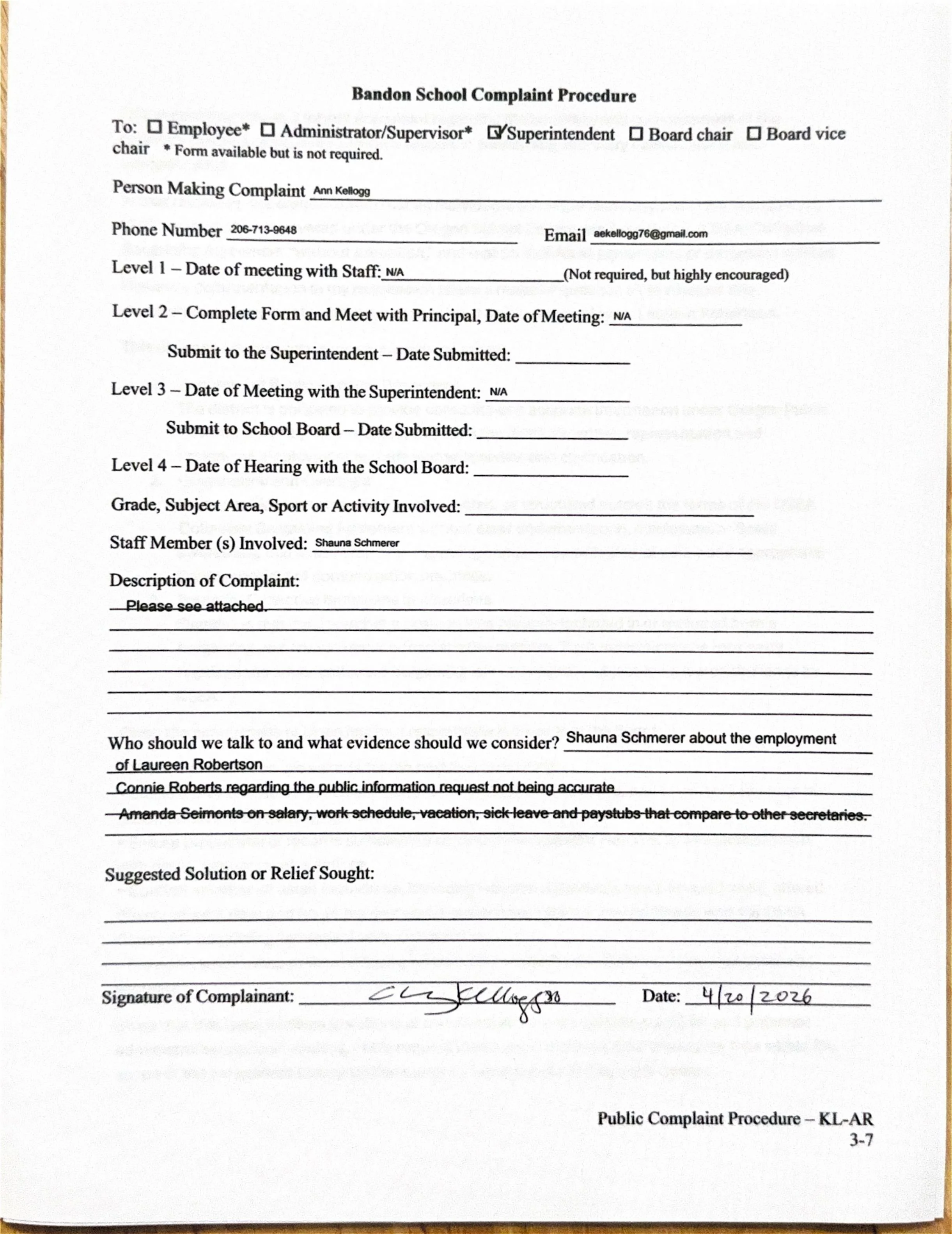 • Clarify what administrative and/or Board-level approvals were involved in any such decisionsThis attached complaint is submitted in the interest of ensuring compliance, protecting the district from avoidable legal exposure, and maintaining public trust in district governance.
