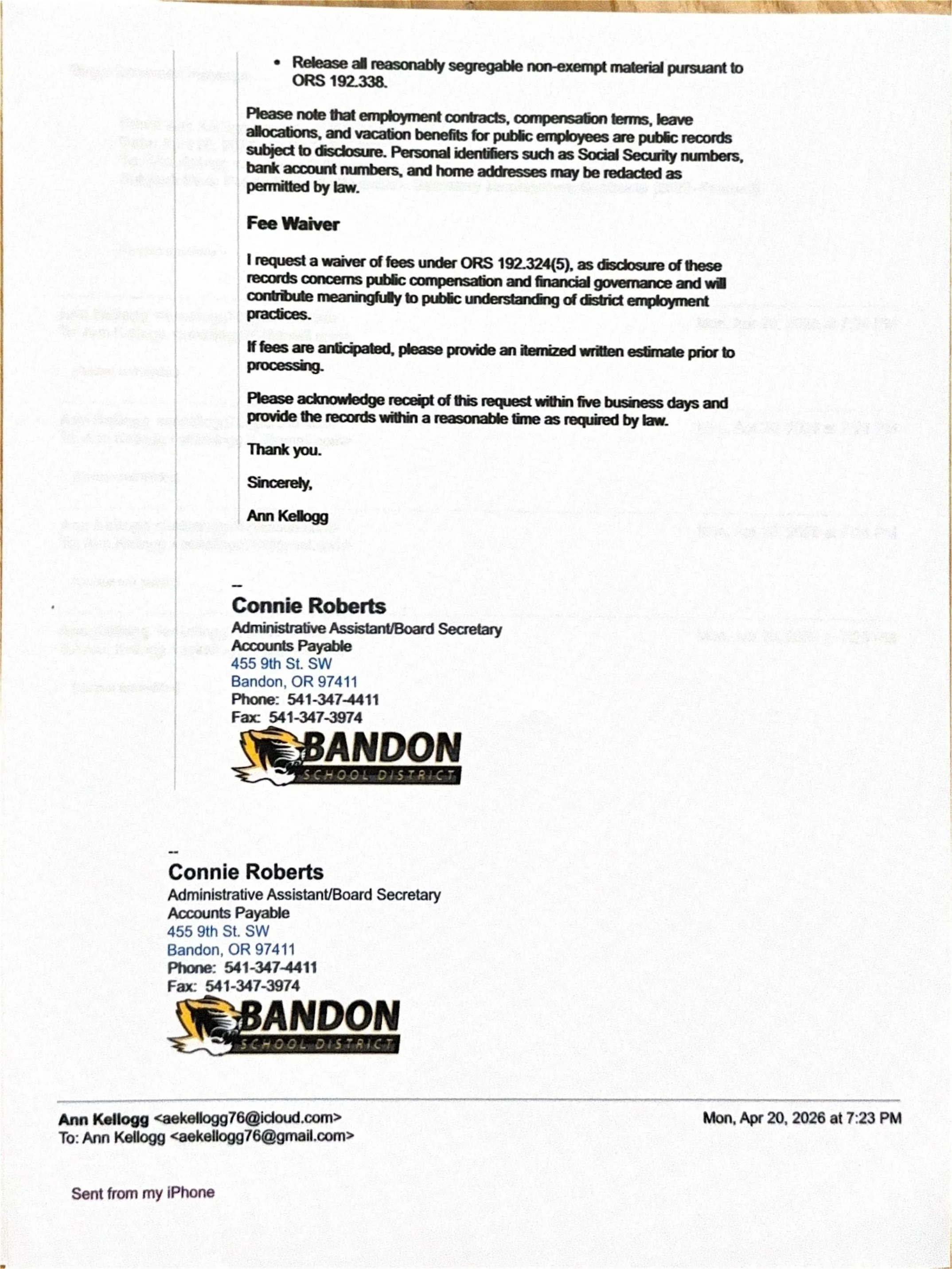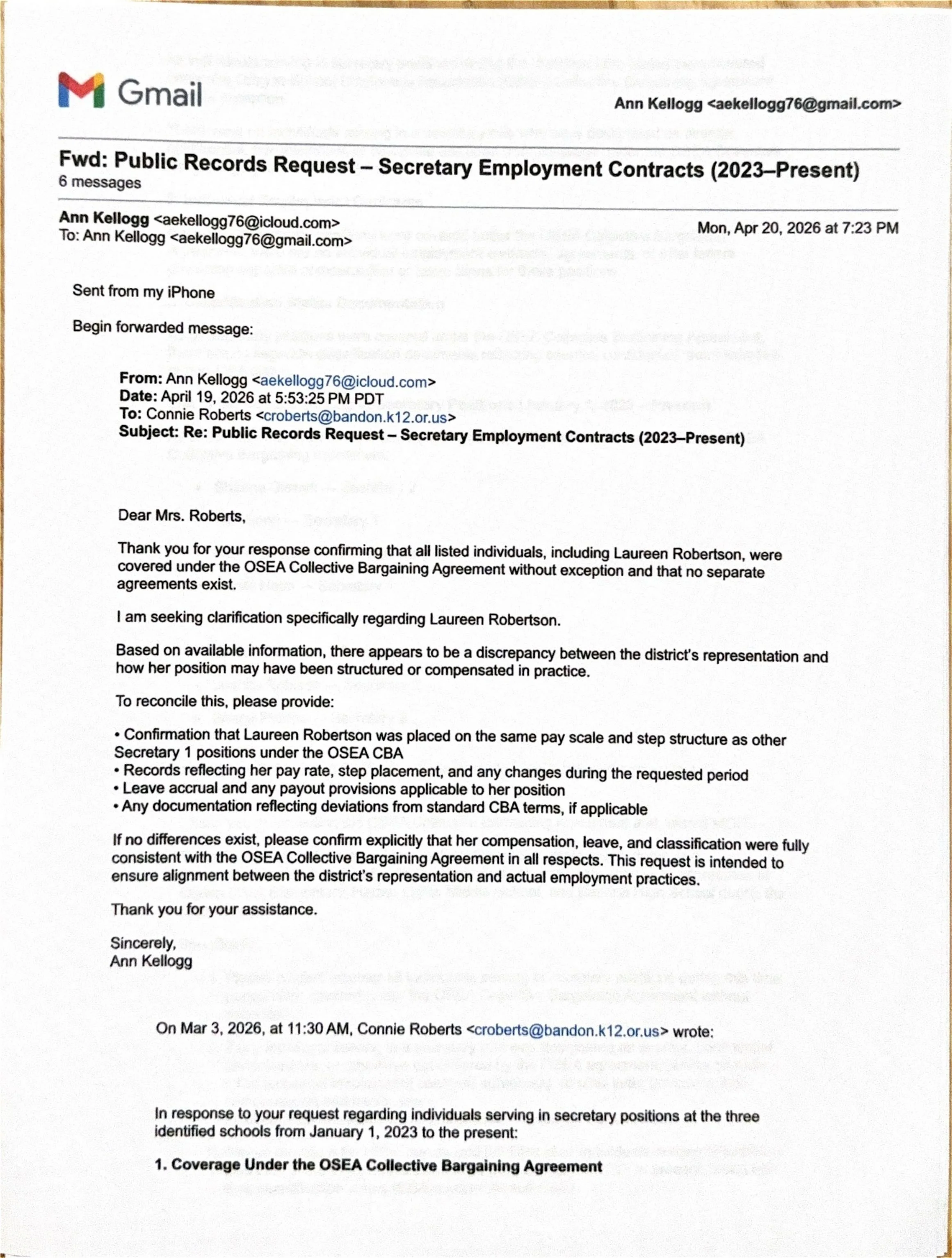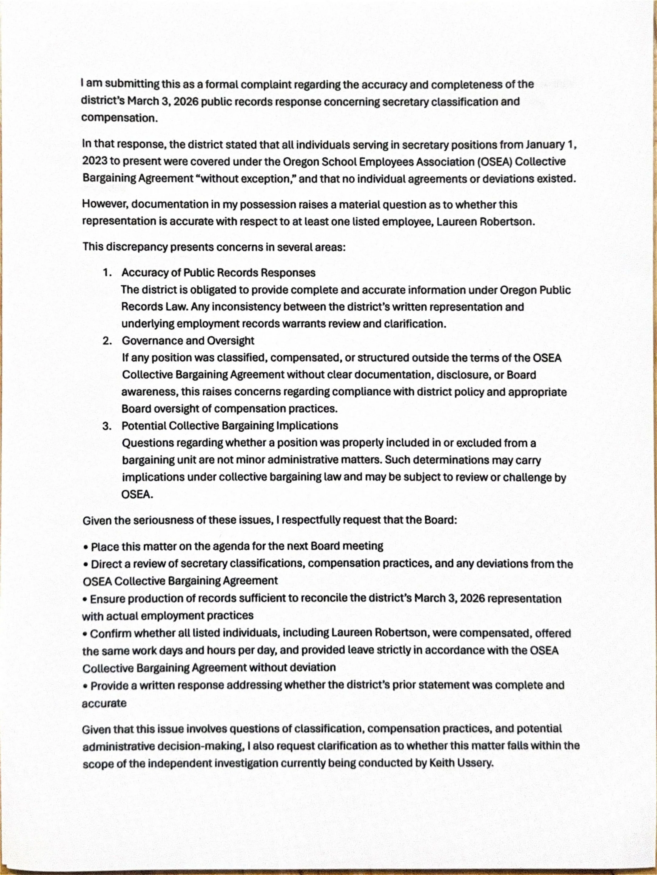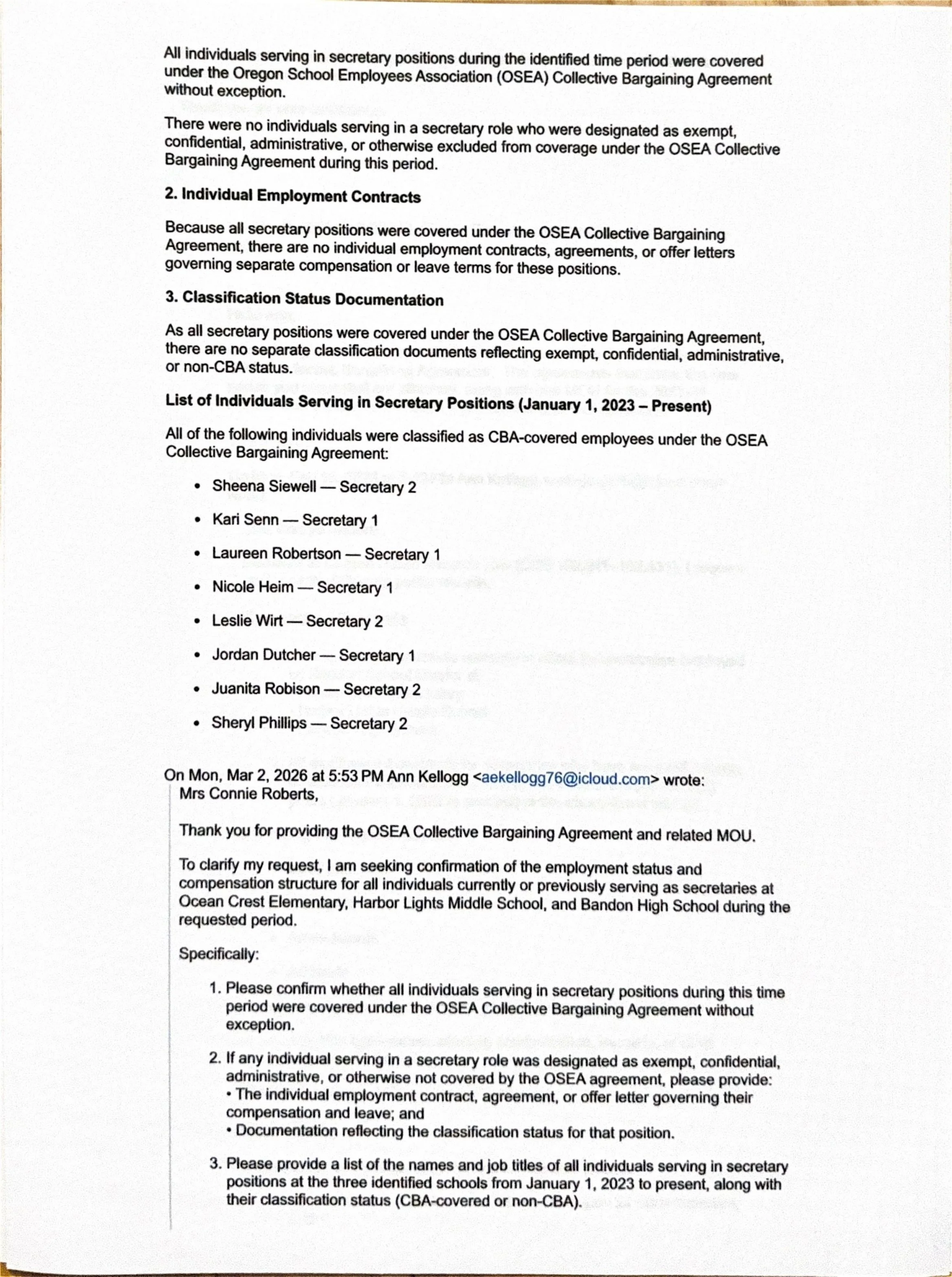 The district previously represented in a March 3, 2026 public records response that all individuals serving in secretary positions from January 1, 2023 to present were covered under the Oregon School Employees Association (OSEA) Collective Bargaining Agreement “without exception,” and that no individual agreements or deviations existed. Documentation in my possession raises a material question as to whether this representation is accurate with respect to Laureen Robertson (she is missing from the union roster). If an employee has been placed in a role with classification, compensation, or benefits outside the terms of the applicable collective bargaining agreement, particularly in circumstances that may reflect preferential treatment, this raises significant concerns.